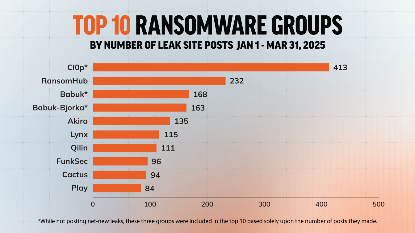 The heavy hitters of the current ransomware landscape are a mixture of new and familiar faces, largely leaning into the affiliate model or announcing partnerships with well-known groups for a visibility boost. There were 80 active groups in Q1, 16 of them new since January 1. There are also 13 groups that were active in Q4, 2024, but have thus far been silent in 2025.