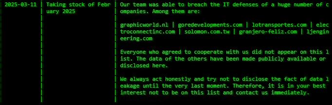 Although not as visible as some other ransomware groups in Q1 2025, RaaS operator Qilin has achieved some notable success. First observed in 2022, Qilin ransomware has been used to target a wide variety of industries which includes the healthcare, financial, and manufacturing sectors. Known for spear phishing and making use of compromised credentials, Qilin attacks tend to specialize in double extortion and data exfiltration on a large scale—their leaks can range from a few hundred gigabytes to their most recently publicized attack, which is allegedly a haul of 1.1 terabytes of data. Alarmingly, Microsoft has observed North Korean group Moonstone Sleet deploying Qilin ransomware at “a limited number of organizations”, the first time this group has been known to make use of ransomware developed by a RaaS threat actor.