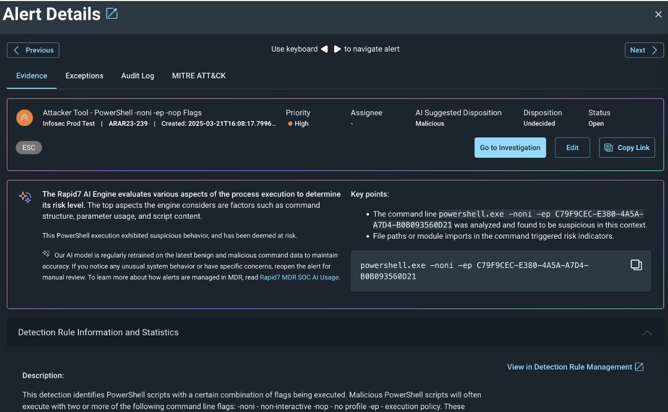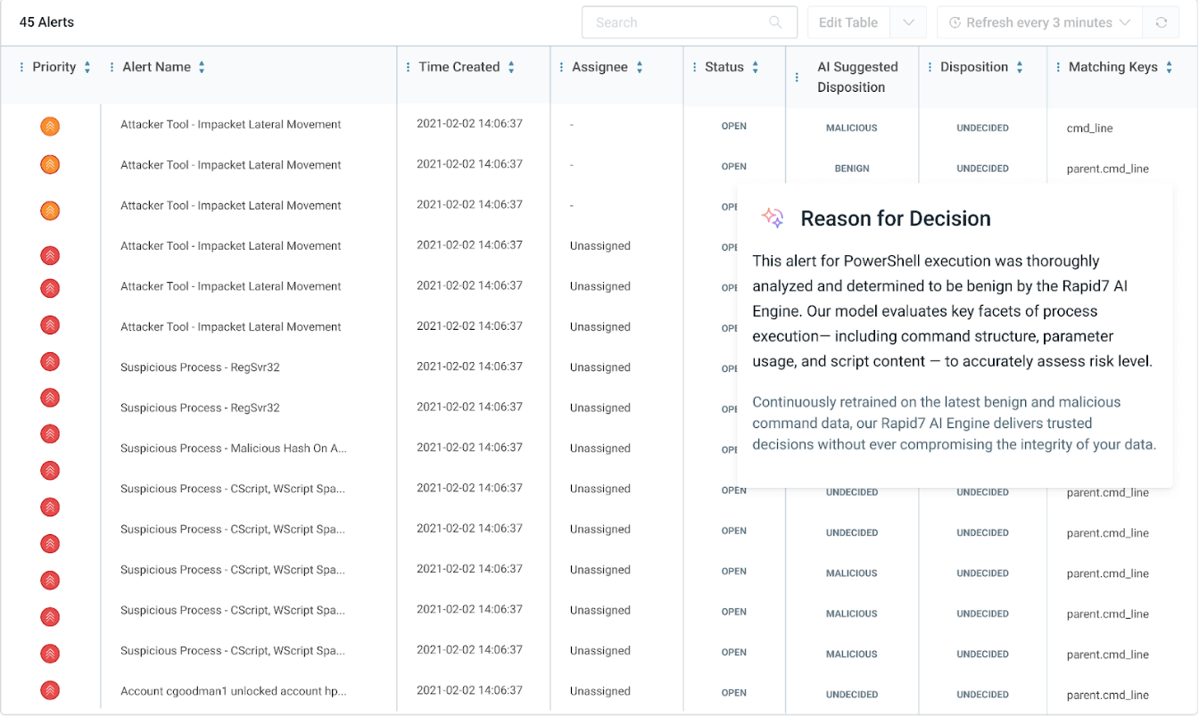 Rapid7's AI Alert Triage – trained and tested by the Rapid7 global MDR service across trillions of alerts worldwide — will soon be available to users of our next-gen SIEM, InsightIDR, at no additional cost. The AI Alert Triage engine quickly suggests an initial disposition (benign or malicious) for alerts, providing clarity into why that disposition was chosen and supporting information from the investigation.