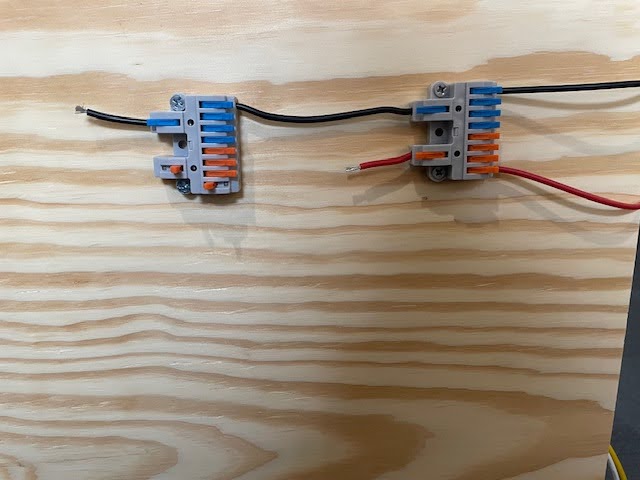 As I will be connecting power through my bench supply I need to design a way to both keep the power connections themselves away from all other components, wires, and water systems and ensure that there is no chance of a short circuit. To solve this in a simple fashion, I lead the wires around to the back of the panel, where they are the only connections. I then connect the bottom input connection through a terminal block while relaying common through yet one more block, lengthening the distance between the leads. This helps to minimize the risk of a short should either wire disconnect.