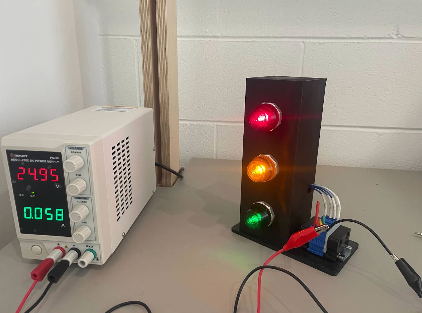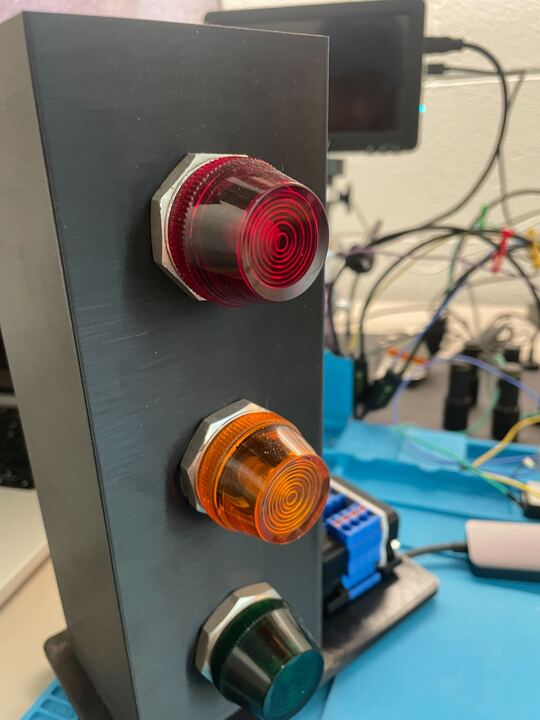 I ordered a stoplight that also runs off of 24v DC to function as our signal to show process status. Upon receiving a new component, the first thing you should do is test its functionality and readings to ensure it was correctly wired and advertised. You don’t want to jump right to 24v if a component can only take 12v - that is a good way to burn something out.
