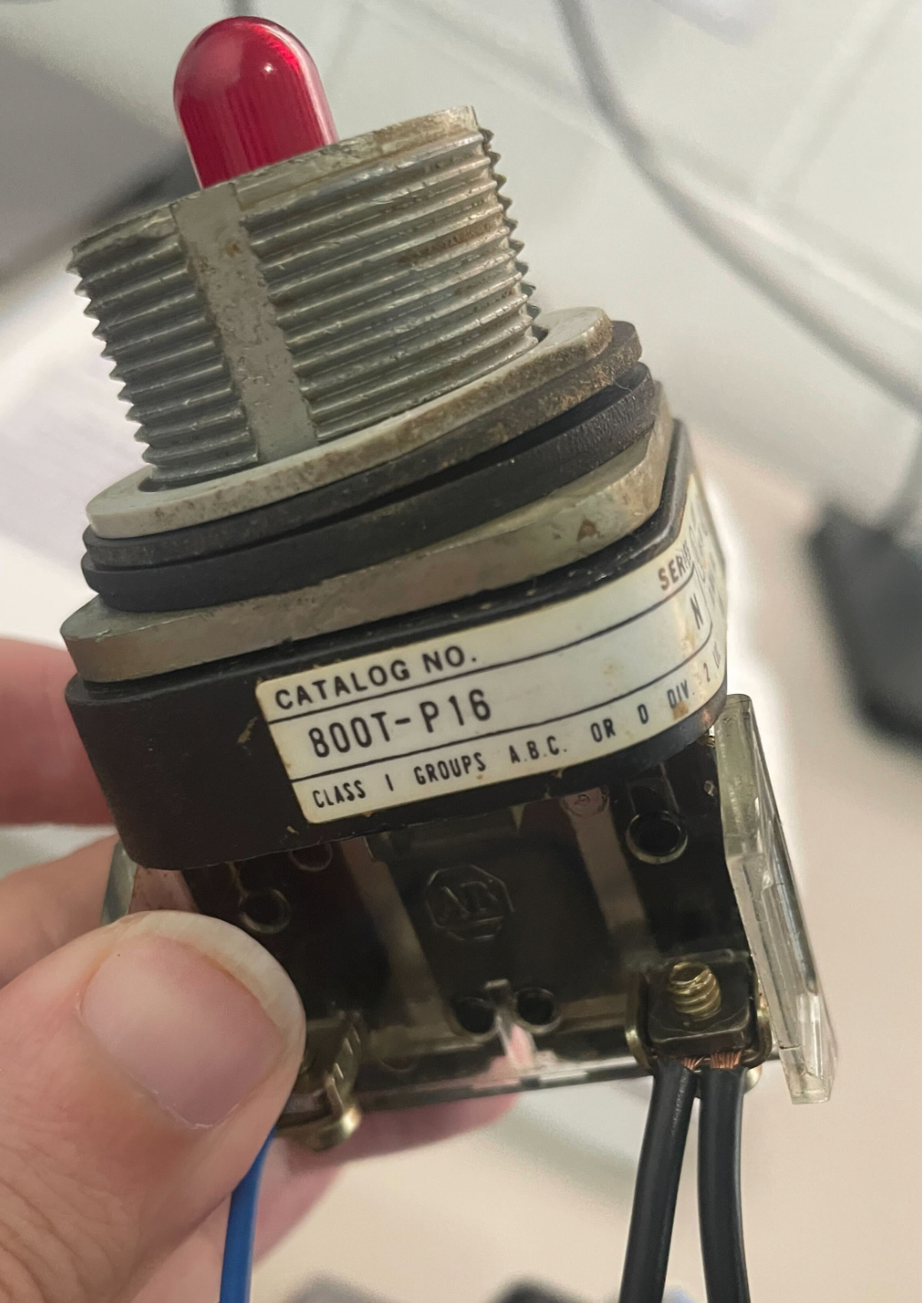 Next we will check the pilot lights to ensure that we don’t provide too much power and blow them out. By taking them out we confirm that they are Allen Bradley 800T-P16 pilot lights. They are rated for up to 120V AC and a high enough amperage rating that nothing we can do with this power supply will burn them out, meaning they are safe for use without any further modifications to the system.