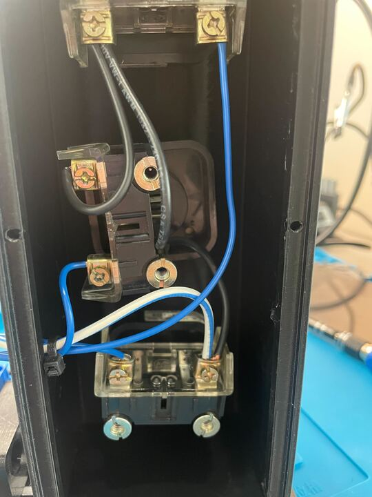 The next step is to open it up and review the wiring. Here you can see the white and blue line leads into the bottom light, then runs as a black wire in series through the others. Meanwhile the blue lines going to the other terminals on the lights appear to be wired in parallel. You don’t need to fully be able to identify those right now, but recognizing that the setup implies that the blue and white line is the common while the blue lines are input is important.