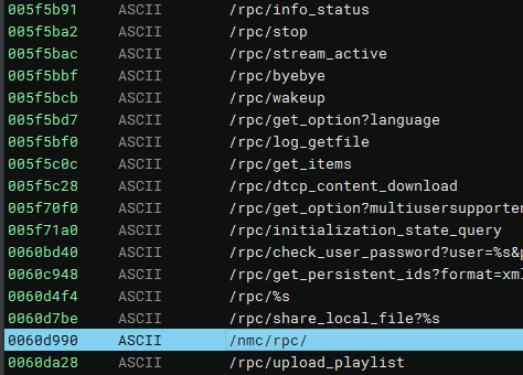 The decompiled binary contains the string "/nmc/rpc/", which is referenced in various functions containing request routing logic within the codebase.