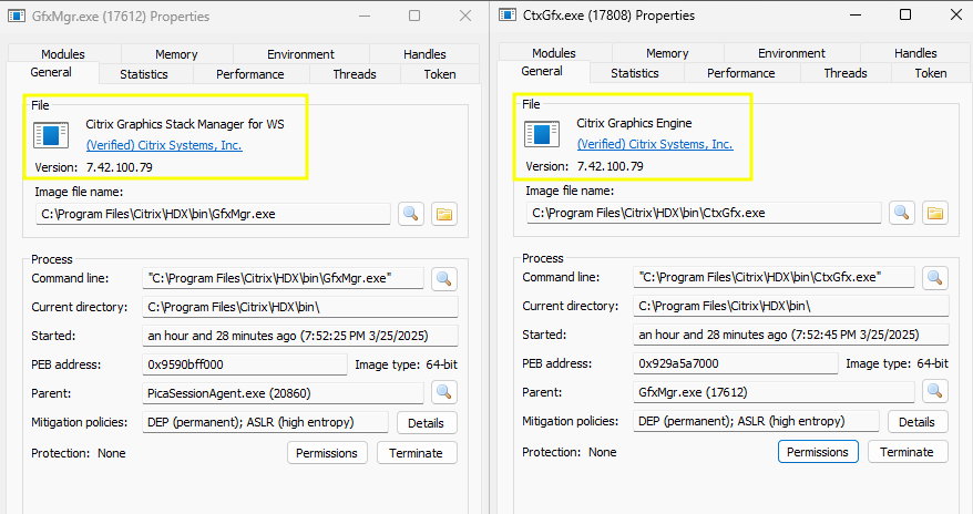 Inspecting both processes shows they are both Citrix signed applications associated with graphics handling. They are components of the High Definition User Experience (HDX) package within the Citrix Virtual Apps and Desktops platform and reside in “C:\program files\Citrix\HDX\bin”: