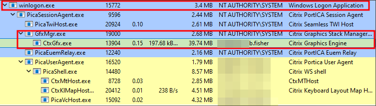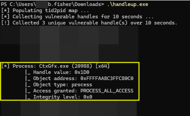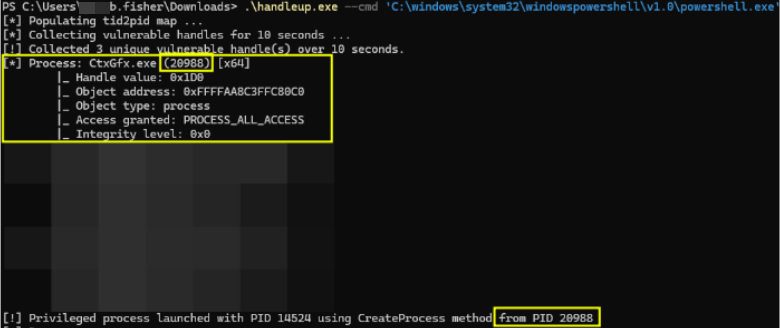 Using a modified version of the public tool “GiveMeAHand”, Rapid7 discovered a SYSTEM process handle with “PROCESS_ALL_ACCESS” rights being leaked into the “CtxGfx.exe” process, which the low-privileged user owns: