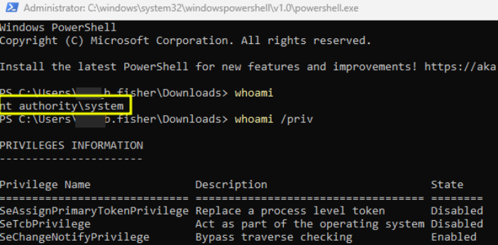 This screenshot shows the current user is now “NT AUTHORITY\SYSTEM”, and possesses a very limited set of privileges within this process. From here, you could add yourself as a local administrator, or perform other actions with the SYSTEM account: