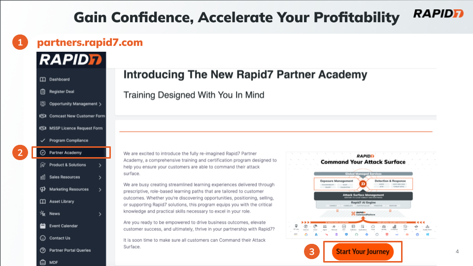 The Rapid7 Partner Portal has been re-engineered to better serve our Partner Community with intuitive navigation, updated sales dashboards, new content, and enhanced collaboration tools. From the homepage, partners can now easily access the Partner Academy, select their role-based learning path, or jump straight to exams to earn their first certification.