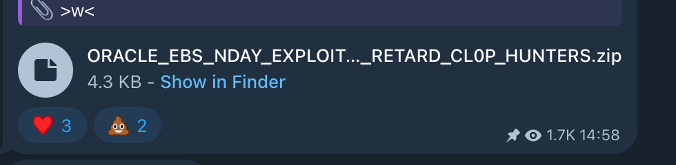 In early October 2025 “SCATTERED LAPSUS$”, Shiny Hunters, or other naming variants used by the threat actor collective, publicly released a small exploit bundle and extortion campaign to a wide-running compromise of Oracle E-Business Suite customers. The exploit bundle was released on their Telegram channel: