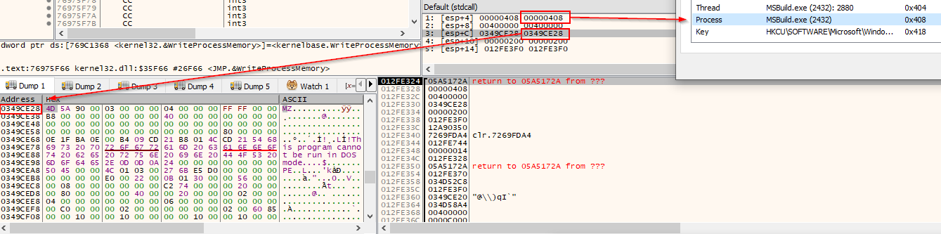 To bypass the obfuscation, we used x32dbg to get to the part where malware is writing the code into a suspended MSBuild.exe and dumping the payload from the memory.