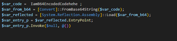 This code uses PowerShell to download a remote script from cmb8k1nbj000008l1api07o0n[.]info/?x and execute it with Invoke-Expression. This gives the attacker an opportunity to make the final payload more modular, as the content of cmb8k1nbj000008l1api07o0n[.]info/?x can be modified. At the time of the analysis, this URL was hosting a PowerShell script which is almost identical to the original script’s reflective execution function.