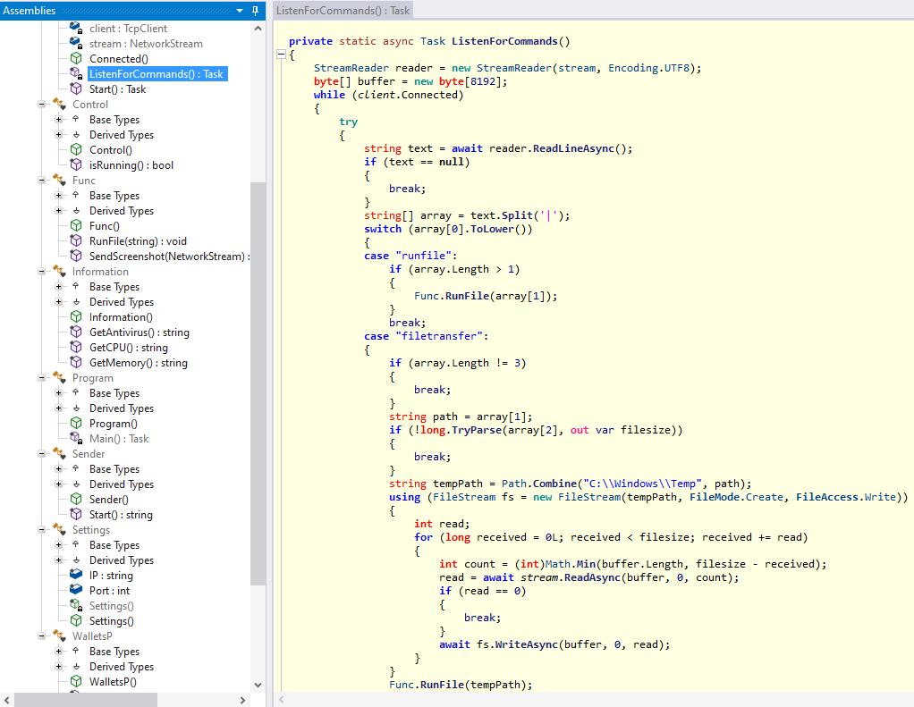 Figure 6: Snippet of the function ListenForCommands, responsible for handling commands sent by C2