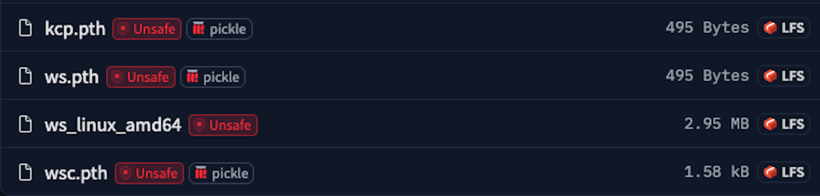 Upon deserialization via torch.load(), the pickle files executed embedded shell commands to download and run ELF binaries.