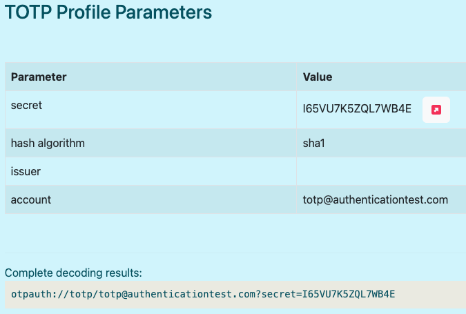 As you can see in the screenshot below, our simple QR code decodes to the following value: otpauth://totp/[email protected]?secret=I65VU7K5ZQL7WB4E
