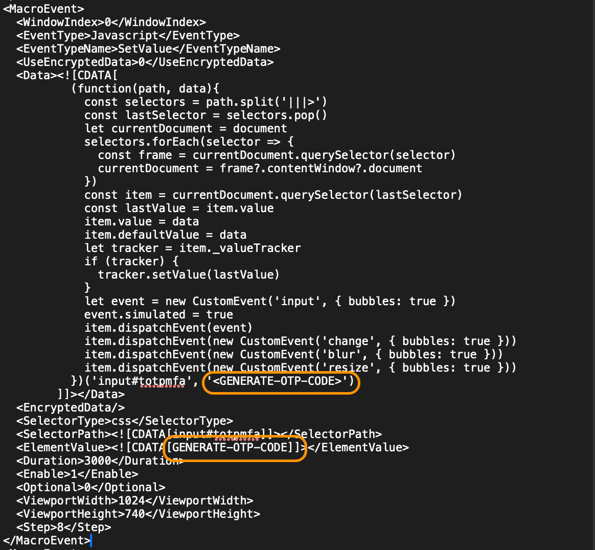 The macro file you just downloaded contains your recorded actions, including the specific OTP code you used. We need to replace that static code with a dynamic placeholder.