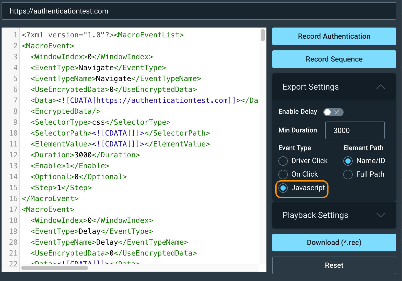 Choose Macro as the authentication type and upload your edited .rec file.
