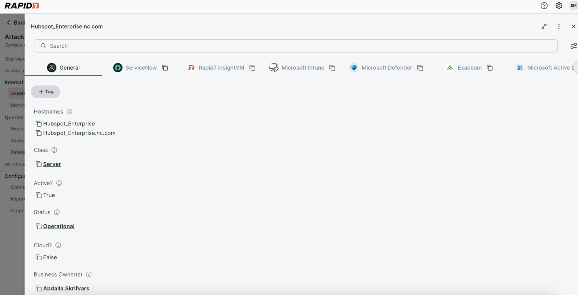 Once your connectors are running, you can view any asset in Surface Command and immediately see which security tools are reporting on it. This makes it easy to identify gaps in protection, for example, an asset without endpoint detection or vulnerability coverage.