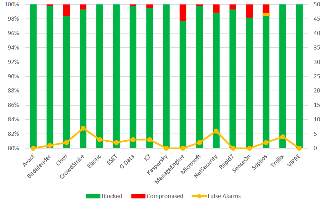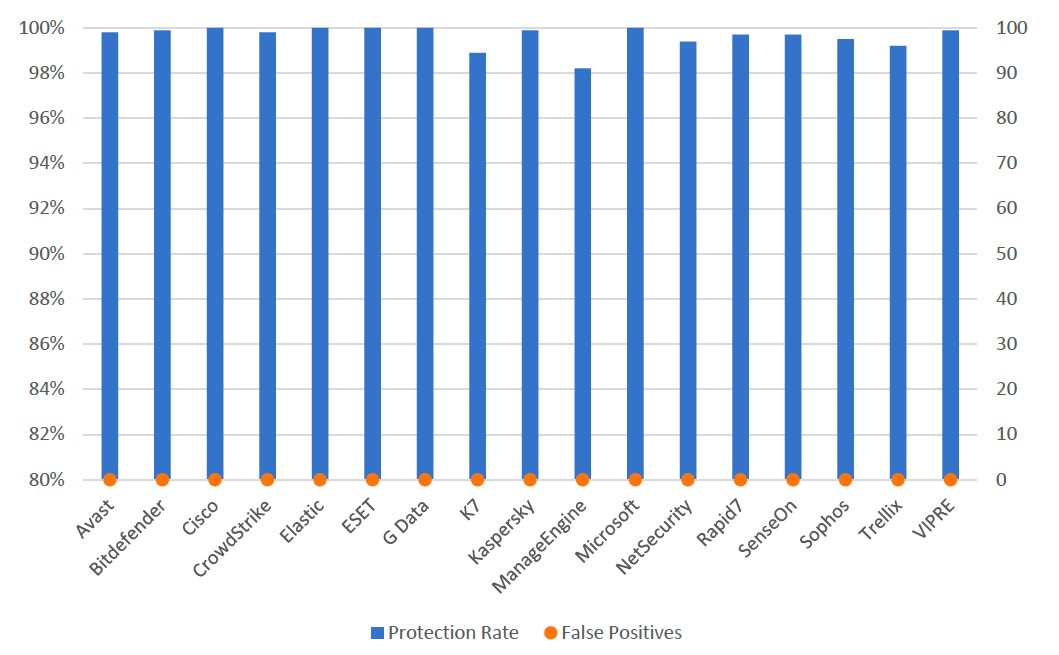 The Real-World Protection Test measures how effectively products prevent live unknown threats encountered during everyday internet use. Rapid7 performed strongly among top-tier competitors. Our solution maintained excellent protection rates while achieving zero false alarms, a critical metric for security teams managing alert fatigue and operational efficiency.