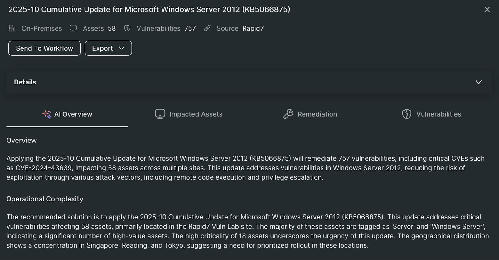 Adding AI sharpens that focus. AI generated risk intelligence within Remediation Hub helps turn noise into action. To support employee decision-making, each summary uses AI to fuse exploit signals, business context, and vulnerability data into a short, plain-language brief with clear next steps. From there, security teams can open tickets, target high-impact asset groups, or trigger automation. The result: shared context, fewer debates, faster risk reduction and reduced mean time to remediate (MTTR).