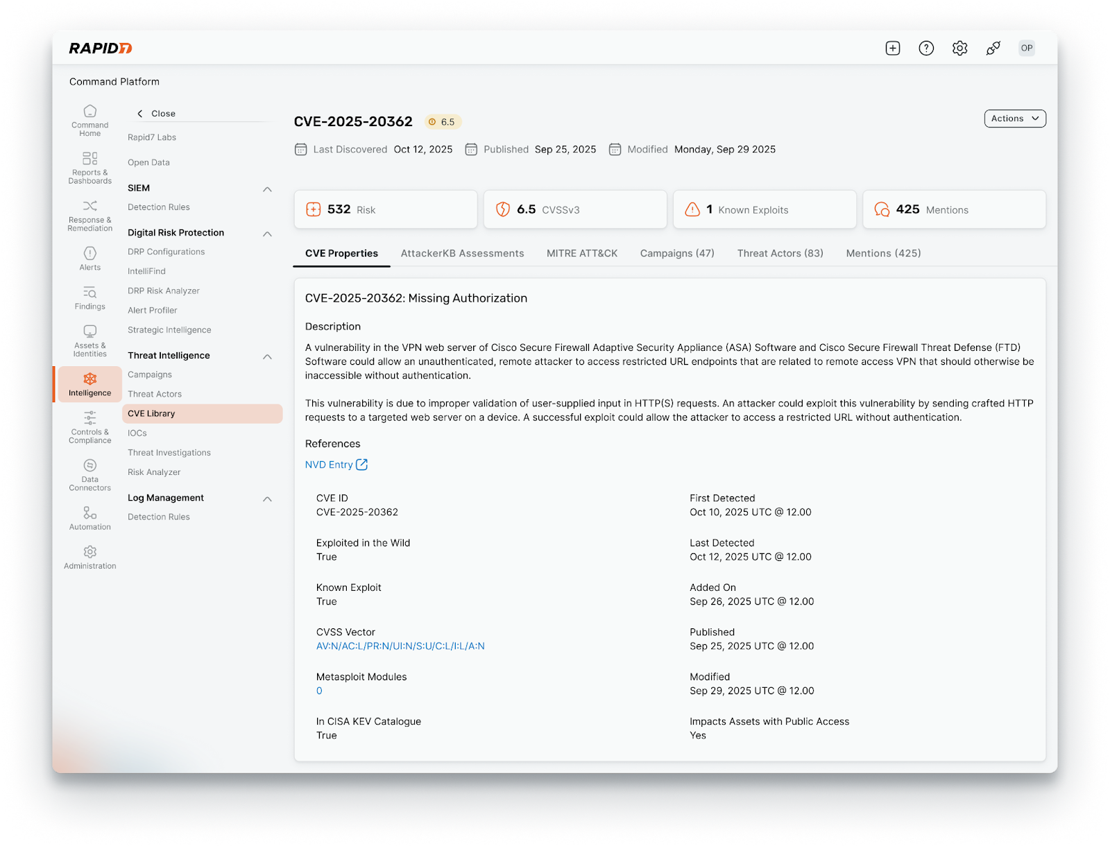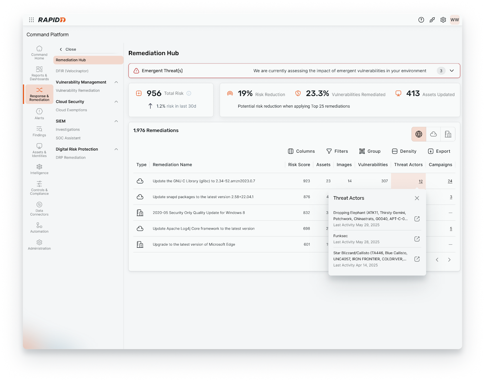 This unified approach enables security teams to prioritize actions based on a clear, AI-generated summary, validate the urgency with external, real-world threat actor and campaign insights from Intelligence Hub, and take immediate, informed action - all without leaving Rapid7’s Command Platform.