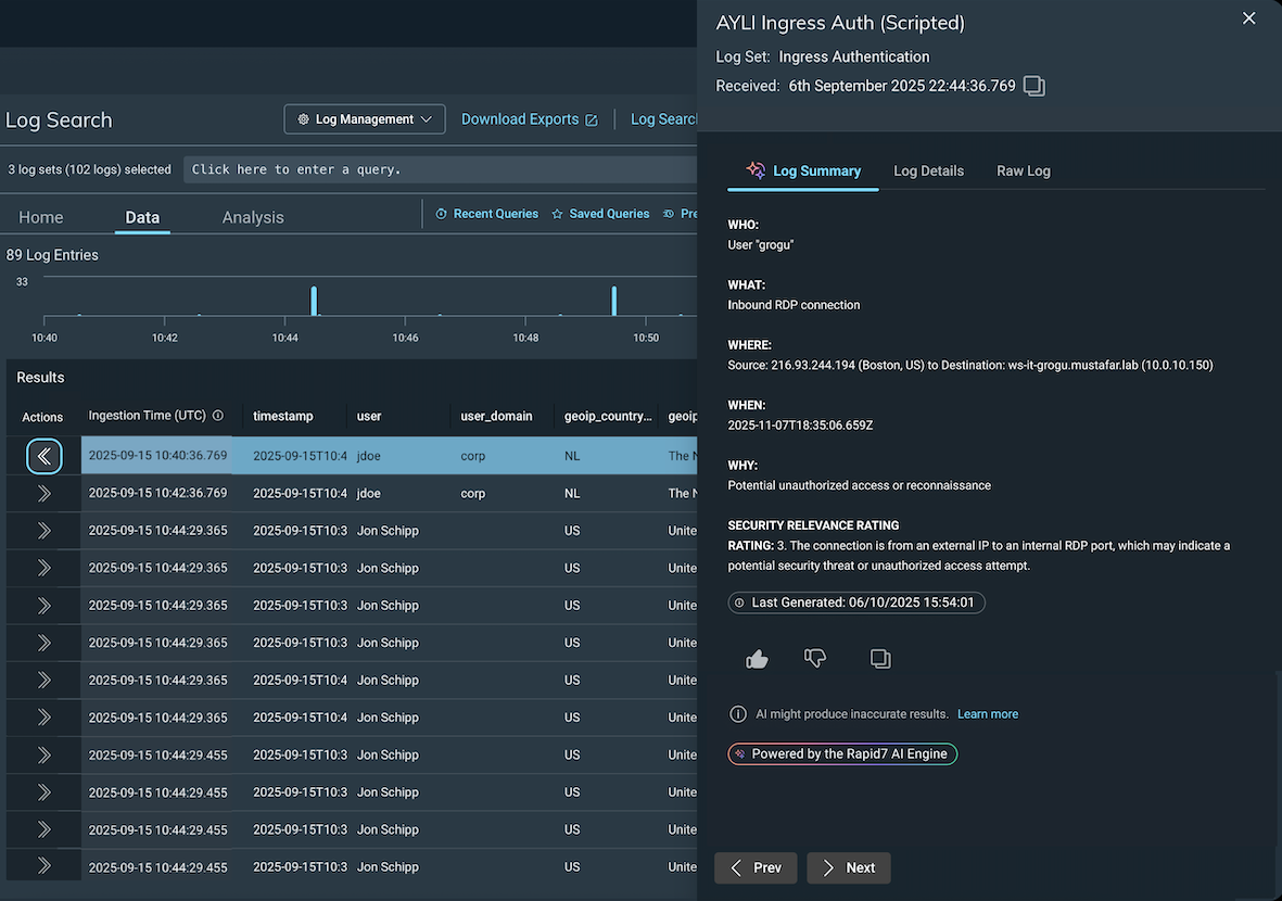 AI-powered Log Entry Summary brings instant clarity to even the most complex log data. By translating raw log lines into a simple “who, what, when, where, and why” framework, analysts can quickly uncover insights without needing to interpret vendor-specific syntax or business logic. This removes the cognitive burden from investigations and hunts, allowing teams to spot threats faster across all data sources. Teams benefit from accelerated triage, more efficient investigations, and smarter decisions driven by clear, actionable context.