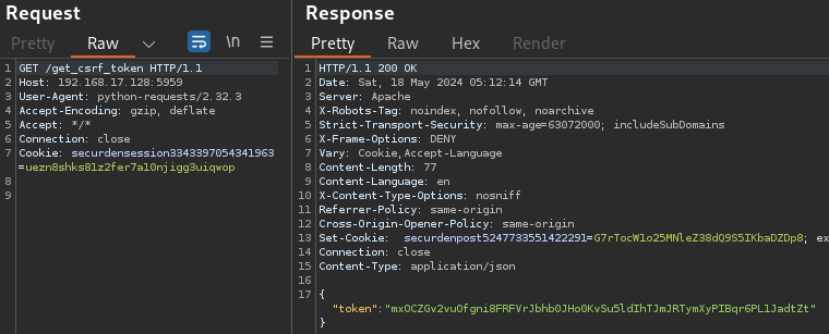 Using the securdensession cookie, Rapid7 browsed to /get_csrf_token and obtained a CSRF token and securdenpost cookie.
