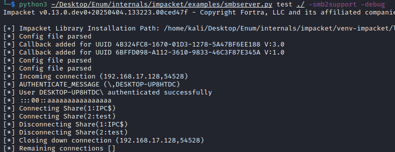 Note: This SMB connection could also be leveraged in a pass-back and NTLMv2 relay attack, as well as offline NTLMv2 hash cracking of the service account running the Unified PAM application.