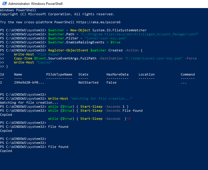 Additionally, Rapid7 discovered that the SSH key tunnel-user-key.pem was deleted from disk after the tunnel was established. Using PowerShell, Rapid7 wrote a small loop to monitor file write events for the key and copy it, and then restarted the Securden service, noticing that SSH log entries aligned with service and server restart times: