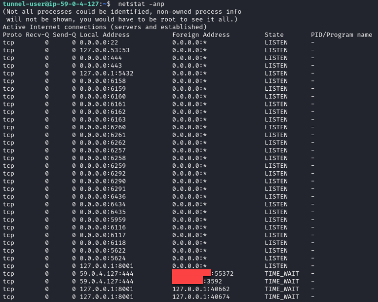To check if the server was exposing the admin panel for Rapid7’s local PAM server used for testing, Rapid7 ran a netstat command, discovering several other tunnels and connections from various IP addresses: