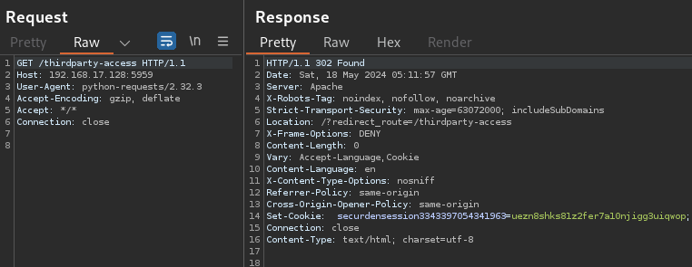 Rapid7 navigated to /thirdparty-access and obtained a securdensession cookie: