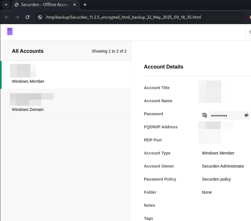 The backup file can be decrypted using the password defined by the attacker, revealing a full backup of all passwords stored in the Unified PAM: