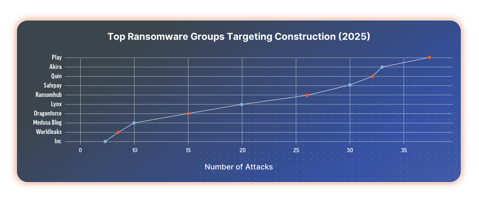 In 2025, the ransomware groups that targeted construction companies most frequently were Play, Akira, Qilin (AKA Agenda), SafePay, RansomHub, Lynx, DragonForce, Medusa, WorldLeaks, and INC Ransom. Notably, RansomHub is no longer active in its original form.