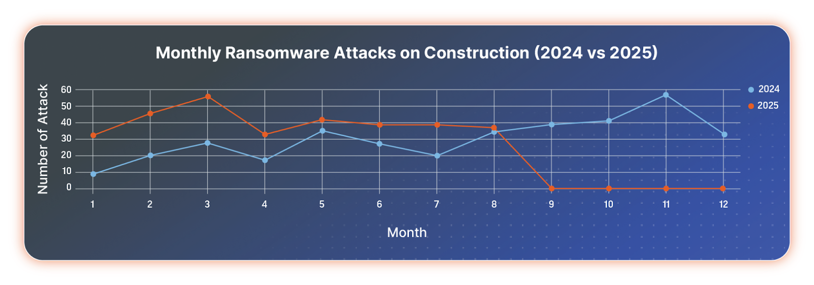 Monthly comparison of ransomware attacks against the construction industry 2024 vs. 2025