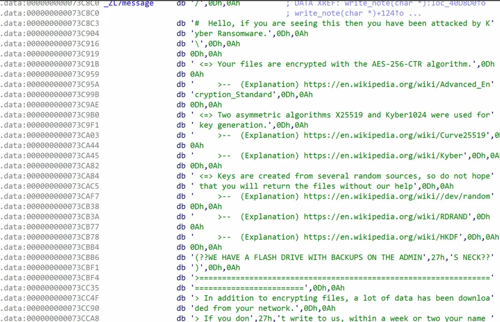 The ransom note claims that for encryption it uses AES-256-CTR, X25519 and Kyber1024 algorithms.