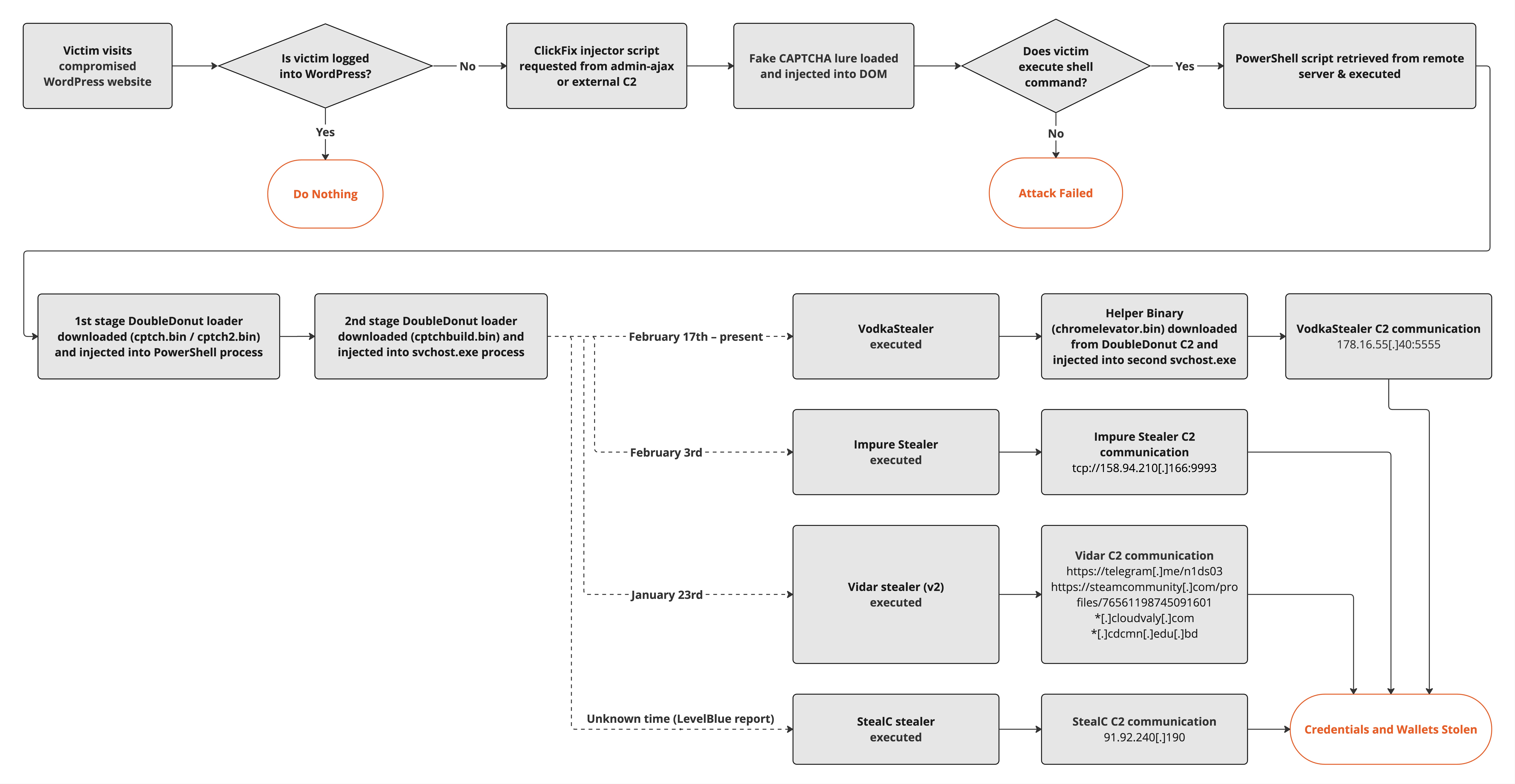 In this blog, we provide an in-depth technical analysis of the complete infection chain, from the first compromised website load, through obfuscated JavaScript, several PowerShell stagers and in-memory shellcode loaders, to several final infostealer payloads observed within the last month: An evolved variant of Vidar stealer, an unnamed .NET stealer we are calling Impure Stealer, and a new C++ stealer, which we believe to be specific to this campaign, and which has been dubbed VodkaStealer. Furthermore, we publish an extensive list of IoCs and YARA detection rules, as well as various resources for unpacking the loader shellcode and algorithms to decrypt stealer configurations, so that defenders can stay ahead of this threat.
