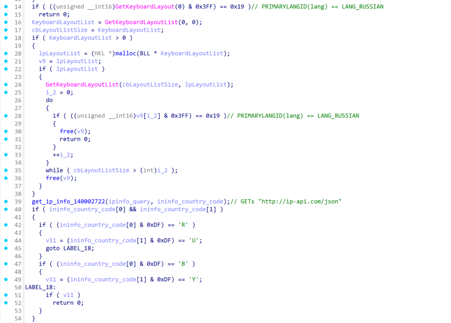 As is the case with practically all commodity infostealers, the sample starts by checking if any of the enabled keyboard layouts match the Russian language, and if the public IP of the infected machine suggests location within Russia or Belarus. In these cases, the malware terminates.